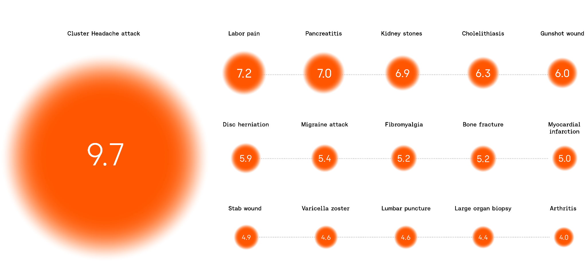 Still, empirically this scale provides some useful signal that allows us to compare experiences, even if imperfectly — by averaging out individual differences. Cluster headaches frequently get rated at 10 on this scale.