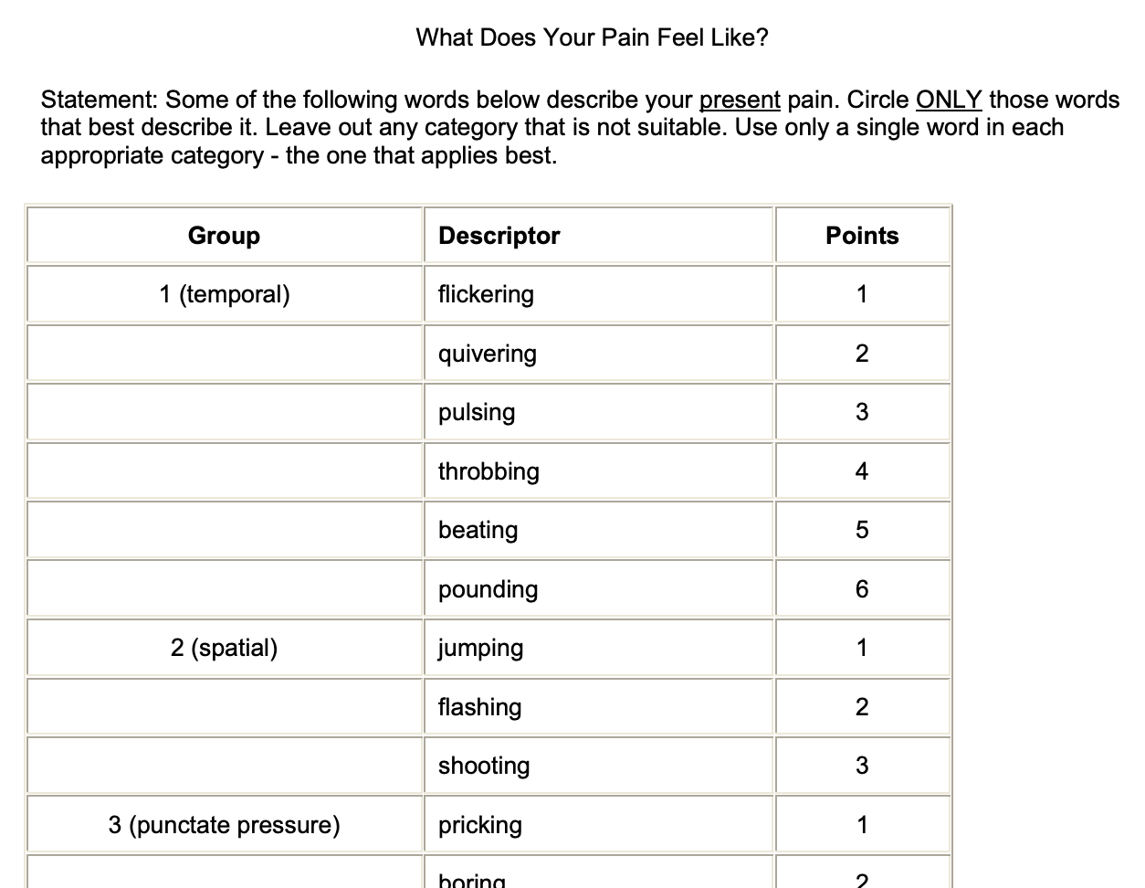 The above is an excerpt from a commonly used tool, the McGill Pain Questionnaire.
