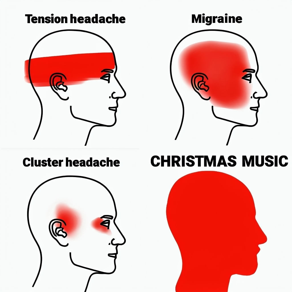 A tension headache is just your regular headache — most people get these from time to time. A person with a tension headache can usually function, especially if they take some ibuprofen or aspirin. I get these headaches occasionally and I can easily imagine someone preferring a mild one to some CHRISTMAS MUSIC.