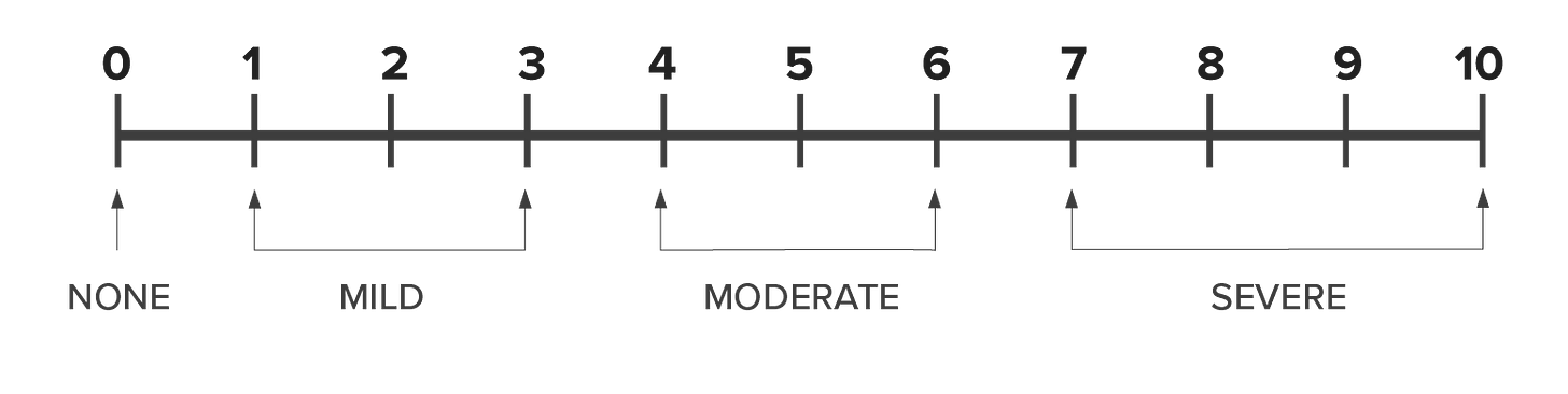 That’s the idea behind the 0–10 Numeric Rating Scale — one of the most widely used pain scales in clinical care and research. This scale asks people to assign a number from 0 to 10 to their experience, with 0 being “no pain” and 10 being “the worst pain imaginable”. Pretty reasonable, right?